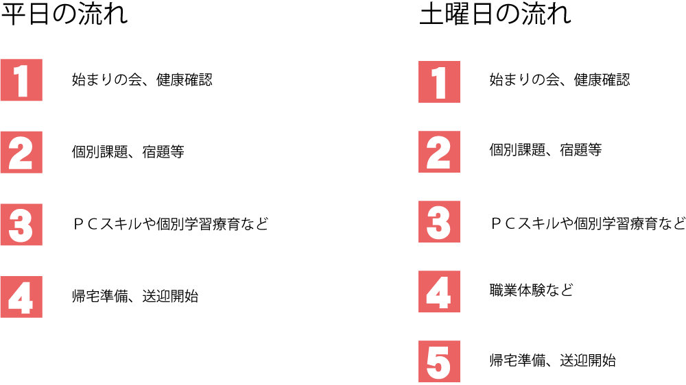 よくある質問(FAQ) Q.見学や体験利用はできますか? A.もちろん歓迎です。お手数ですが、事前にご予約をお願いいたします。 Q.見学や体験利用の際に持参するものはありますか? A.特にありませんが、受給者証がある場合はご持参ください。 Q.受給者証とはなんですか? A.受給者証は福祉サービスを利用するために自治体から交付される証明書です。お子様と保護者様の氏名、住所、利用できるサービスの種類、利用可能な日数、負担上限月額などが記載されます。受給者証があれば、利用料の9割が自治体負担となります。 Q.既に他の事業所に通っていますが、併用できますか? A.定められた支給量の範囲内であれば併用可能です。1度ご相談ください。 Q.送迎はありますか? A.ございます。遠方の場合は応相談となります。 Q.食事はありますか? A.原則ありません。学校休校日はお弁当をご持参いただきます。